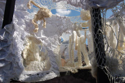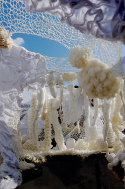 Materials: wool, felt, paper and synthetic recycled yarns, are knitted or sewn by hand.