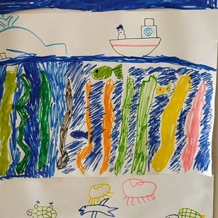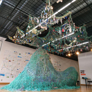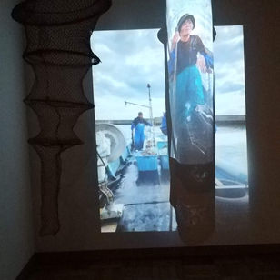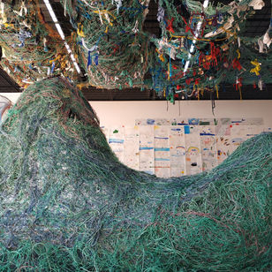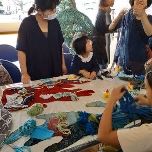 During participative-making sessions involving storytelling and collaborative drawings, local school children were invited to create their interpretation of NORI and the fishing life in Ube. During an 8-hour hand-weaving workshop, the children made a significant and colourful tapestry. The final exhibition in the museum displayed both the collaborative artworks and the artist's interpretation of Ube and NORI, where old fishing nets were layered upon a bamboo structure with a hand-knotting technique. The organic texture of the weaving mimicked a cluster of seaweed on the ocean floor, and the shape of the sculpture reminded me of a submerged mountain covered by layers of nets. The voices of local people recorded during the project's development at Ube Port supported a video projection of a fisherman and his wife at work on their boat. This visual and sound work conveys a powerful insight into Japanese culture and ways of living in Ube, speaking about traditions, hard work, and a special connection to the land and the sea.